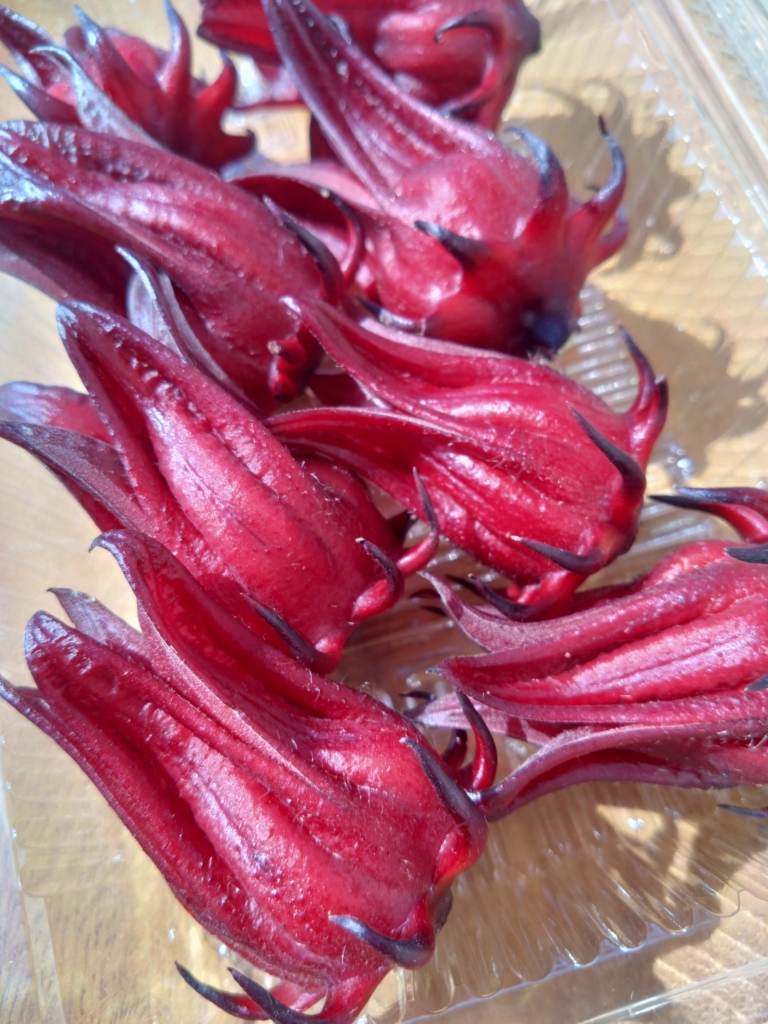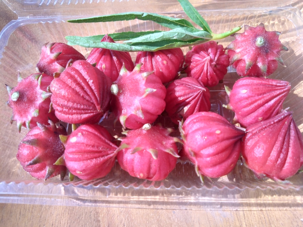 - 収穫したローゼルを水洗いしたあとガクだけにします。