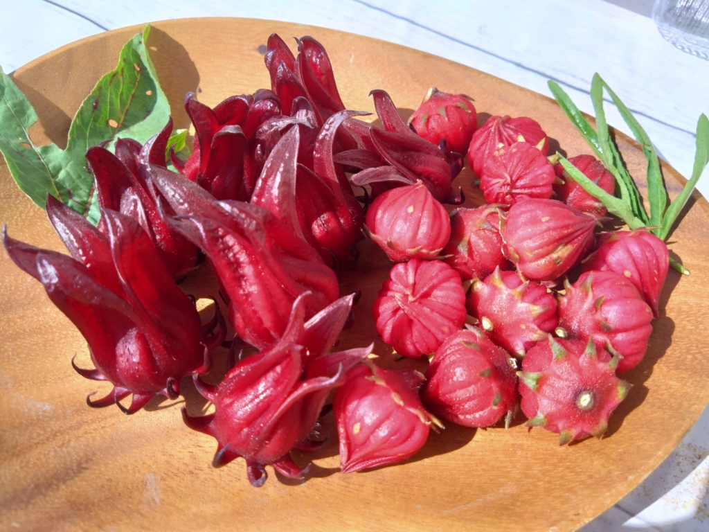 ローゼルは「食用ハイビスカス」とも呼ばれるアオイ科の植物で、花後の赤い肥大したガク片が食用にされます。ハイビスカスティーの原料として有名ですが、その実をジャムやソース、お菓子にしたり、葉や茎をサラダにしたりと幅広く利用できます。強い酸味があり、ビタミンCやクエン酸、アントシアニンを豊富に含んでいます。
