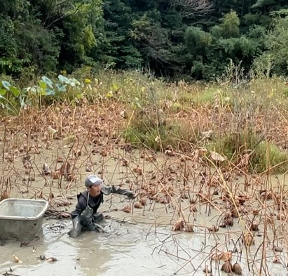 レンコン畑の周りは山に囲まれ他に生産者がいない為、