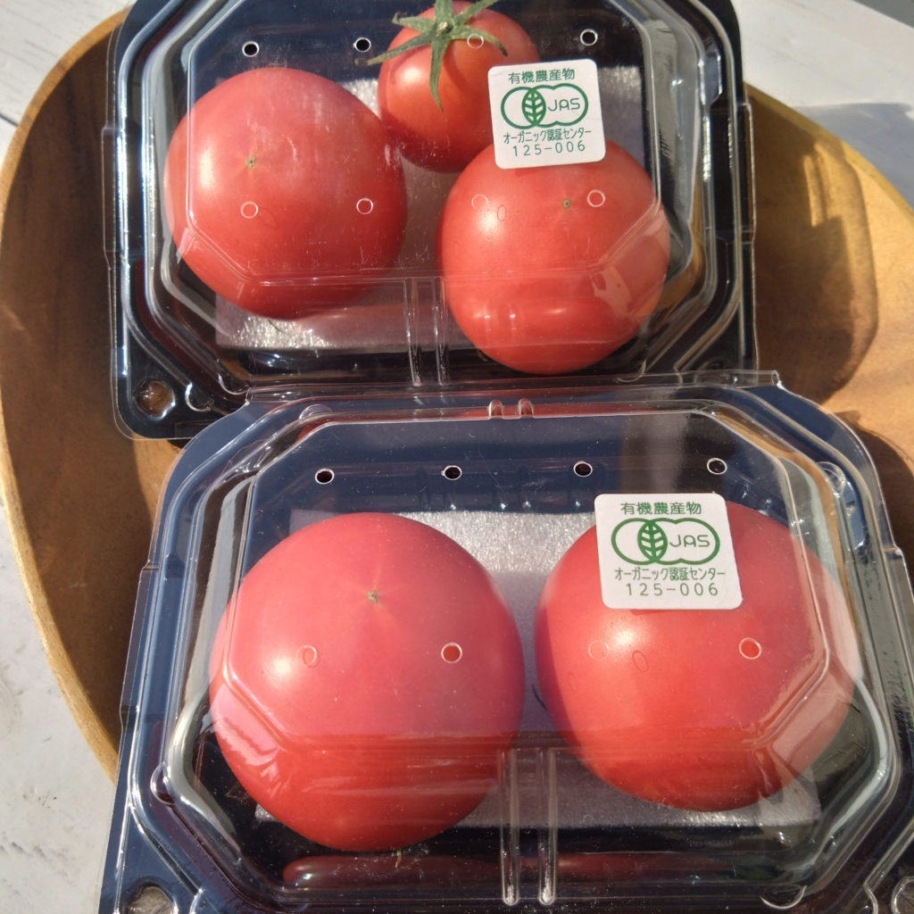 トマトハウスナカムラさんの「アルテトマト」は、大玉トマトの品種を細かな栽培管理によって高糖度に育てており、同じ品種の同じ樹から採れたトマトでも、基準以上の糖度の実と、そうではない実が出来ます。こちらの「有機トマト」は高糖度ではありませんが、数字には表れない旨みがあります。(糖度は5~7程度)有機JAS認証あり