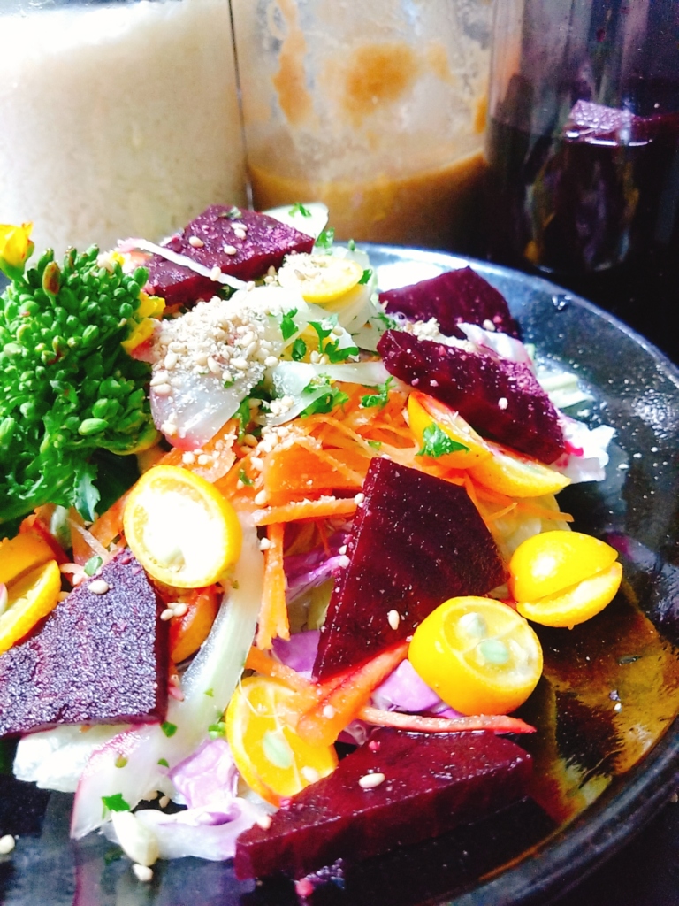 酢漬けにしたビーツと輪切りにスライスしたキンカンをシーザー風ドレッシングで和えてみました。